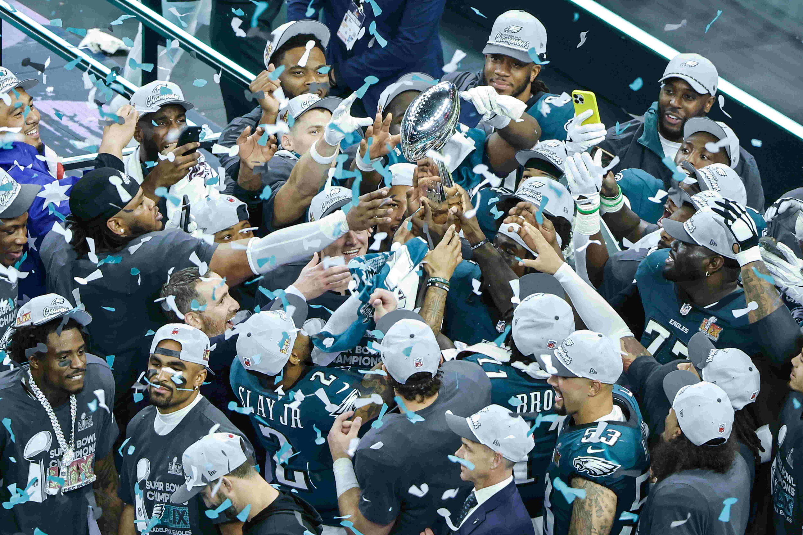 epa11885550 Philadelphia Eagles team members hold the Vince Lombardi Trophy as they celebrate defeating the Kansas City Chiefs during Super Bowl LIX at Caesars Superdome in New Orleans, Louisiana, USA, 09 February 2025. The Super Bowl is the annual championship game of the NFL between the AFC Champion and the NFC Champion and has been held every year since 1967. EPA/CJ GUNTHER